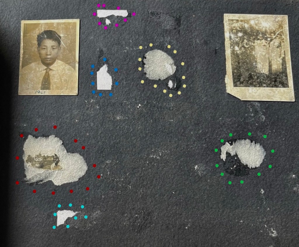 In the courts of my people, here is the case I always make for the importance of the family album; I begin by showing photographs (see Image 1), devoured by fungus, as all photographs will eventually be in the sub tropical rain forest of Tamenglong district if left uncared for. The black-and-white prints on fiber based paper are at risk of disappearing altogether (see Image 3). Some pages show only the marks of photographs once pasted there, now stolen or missing (see Image 2). Some us may know all too well, the vain effort of shifting our family albums to to Imphal to prevent destruction, only for them to meet the tragic fate of being drowned in the capital’s monsoon floods.
