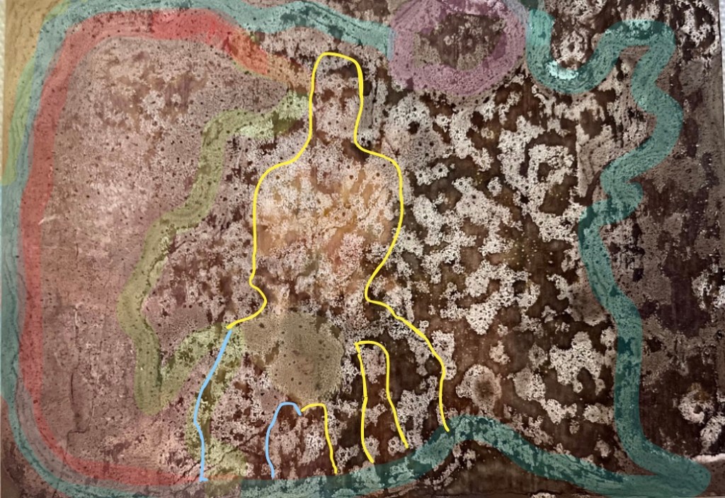 Image 1 : Unidentifiable photograph covered by fungal mould from the collections of Jiugailiu and Gaikhuanlung Gangmei. (Lines drawn by author to trace and make sense of figures the image used to hold)